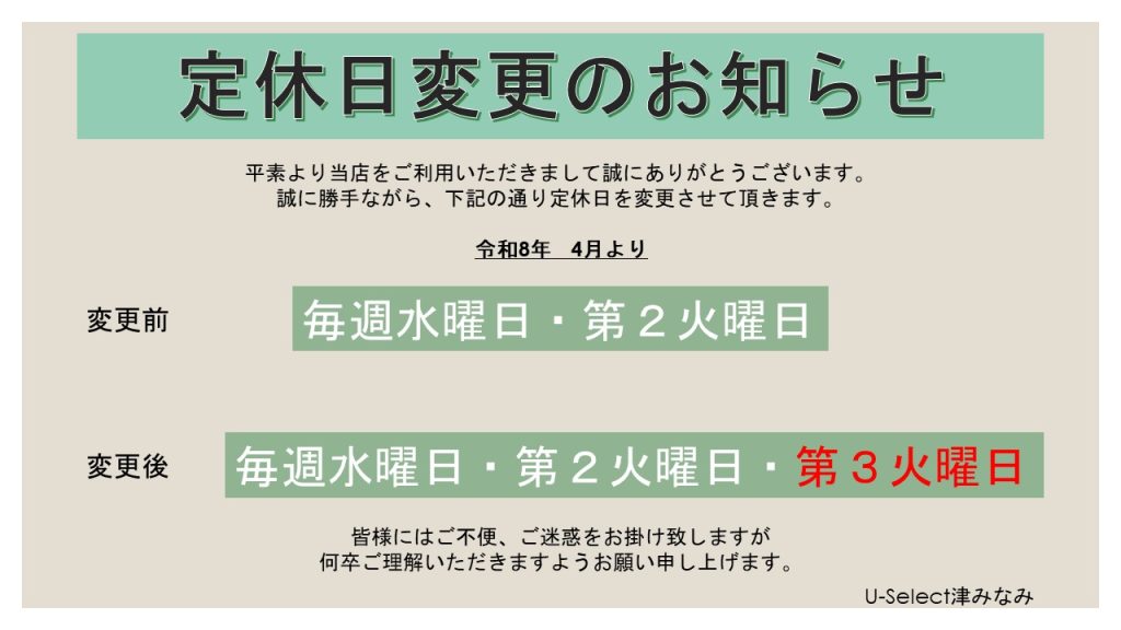 定休日変更のお知らせ⭐US津みなみ⭐